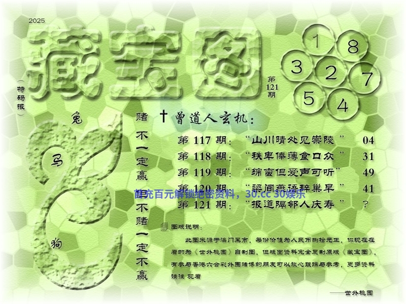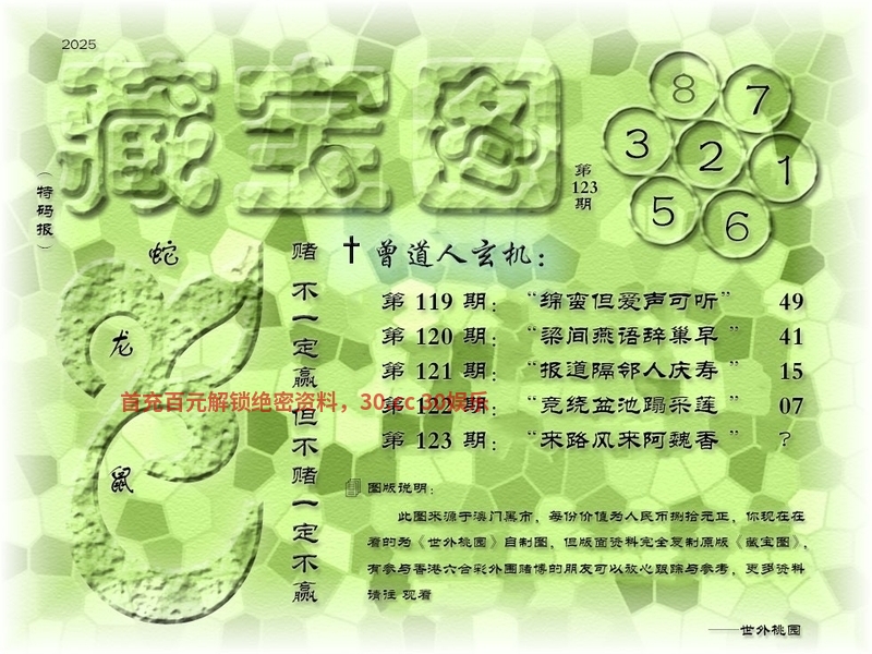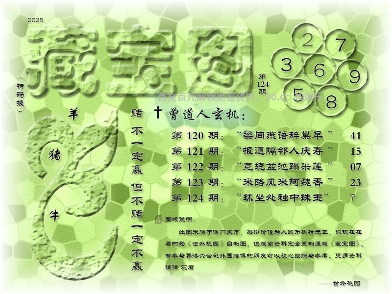 125期藏寶圖新:合向杨妃冢上生 老:沙上不闻鸿雁信 禁:马 禁:8尾 玄機字:《溷》